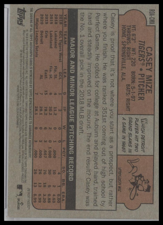 Casey Mize 2021 Topps Heritage #ROA-CMA Autographed Red Ink /72 Detroit Tigers MLB