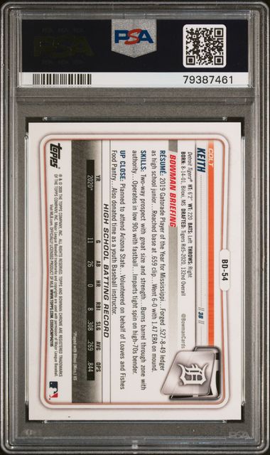 This 2020 Bowman Draft Chrome Blue Refractor card features Colt Keith, a highly sought prospect in the baseball card collecting community. The blue refractor parallel adds significant visual appeal and rarity compared to base versions. Card #BD54 represents an early prospect card from Bowman's premium Chrome line, known for sharp imagery and distinctive refractor technology that creates dynamic light-catching effects. Ideal for collectors building prospect portfolios or those targeting Keith's rookie-era cards. Condition and centering will influence collector value.