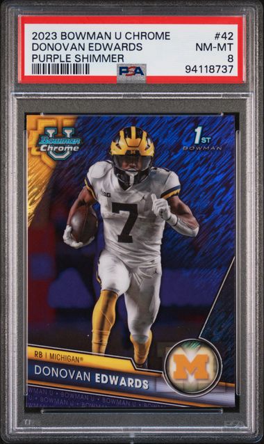 2023 Bowman University Chrome #42 Donovan Edwards Purple Shimmer card represents a premium collectible from one of the hobby's most sought-after modern releases. This parallel variant features the distinctive purple shimmer finish that elevates it above base versions, delivering enhanced visual appeal and rarity. Donovan Edwards' inclusion in Bowman University Chrome solidifies his status as a prospect of significant interest. The card's chromium stock and specialty parallel treatment make it an essential addition for serious collectors pursuing complete Edwards collections or building high-end Bowman University Chrome sets. Condition and centering will determine investment potential.