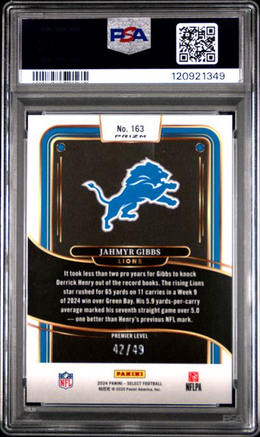 2024 Panini Select #163 Jahmyr Gibbs Neon Green Prizm card showcases the Detroit Lions running back in this highly sought-after parallel variant. The vibrant neon green Prizm finish delivers exceptional visual appeal with its distinctive refractor technology, making it a standout addition to any football card collection. Panini Select is renowned for its premium cardstock and limited print runs, ensuring strong collectibility. Perfect for Gibbs enthusiasts and serious collectors pursuing complete parallel sets.